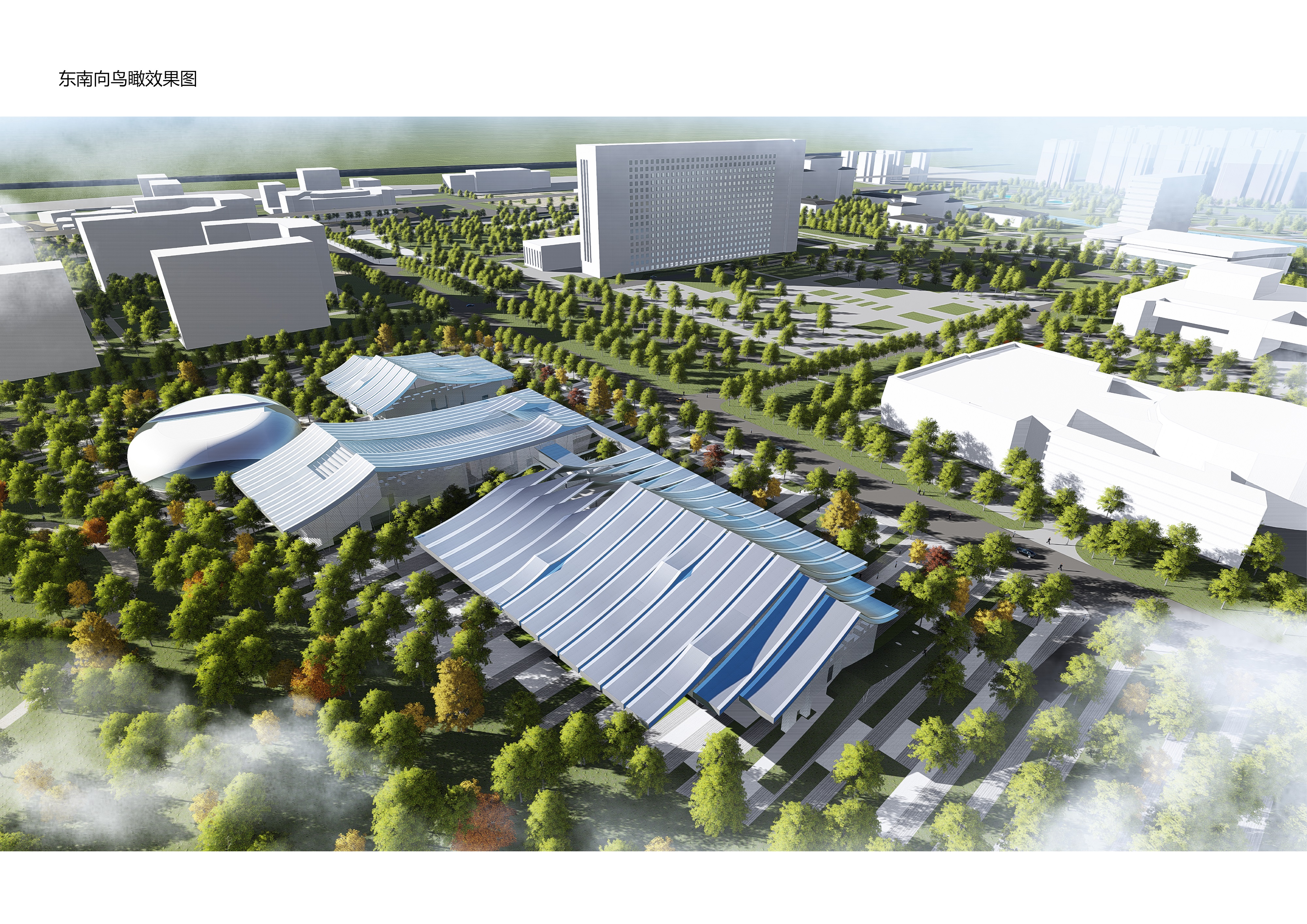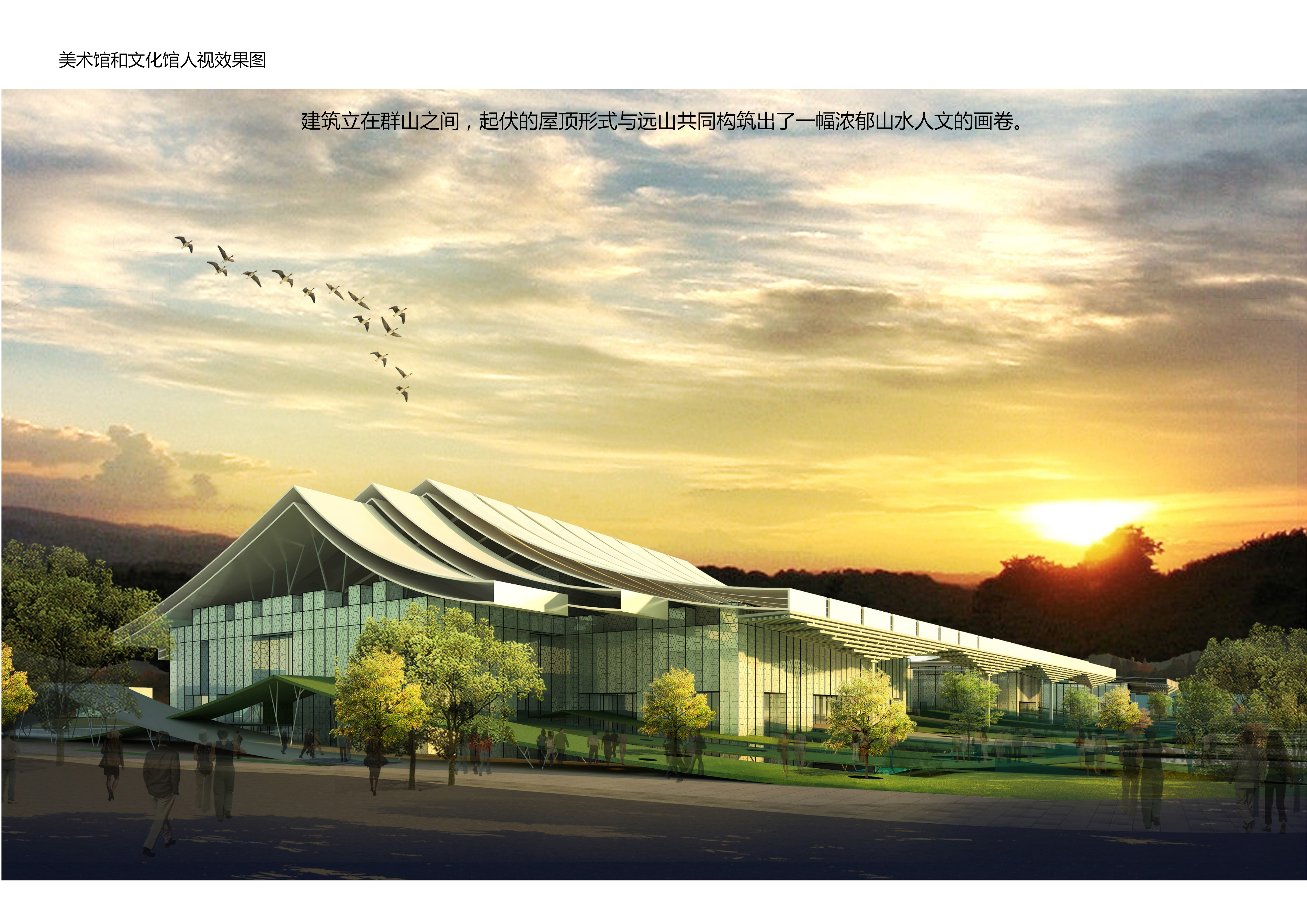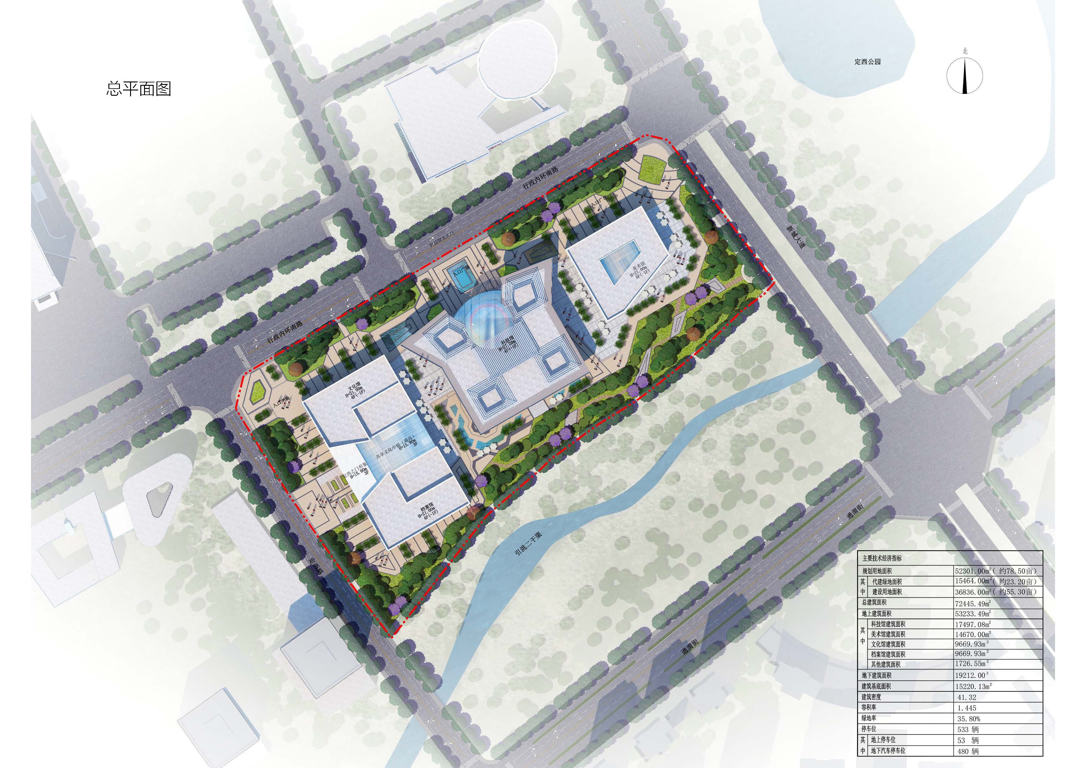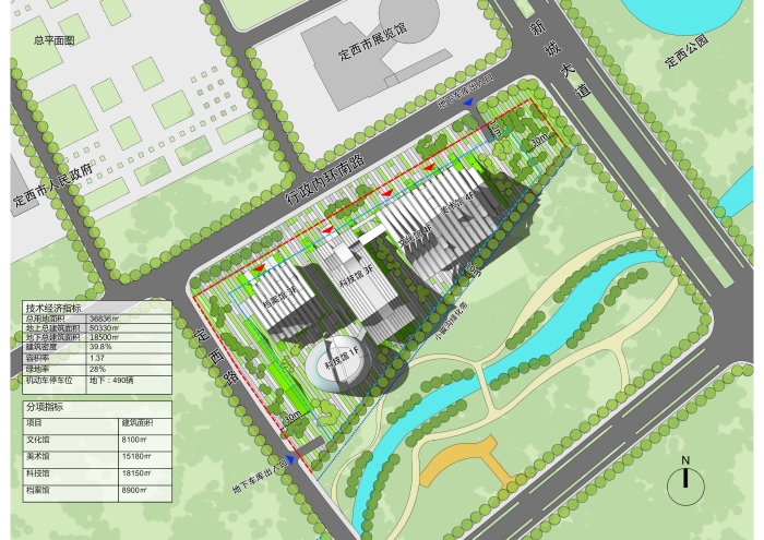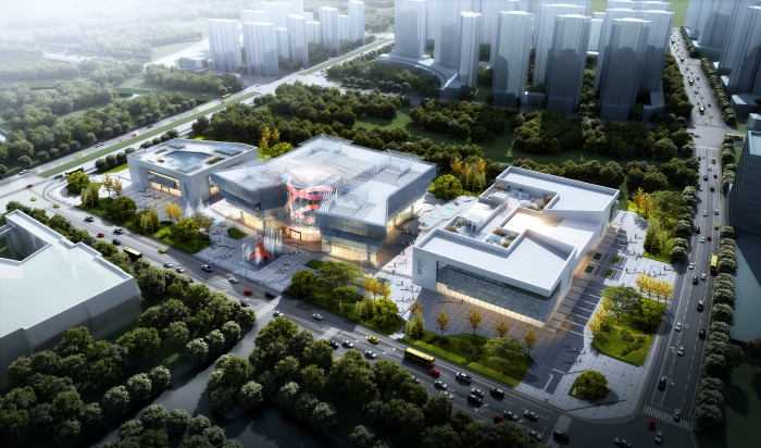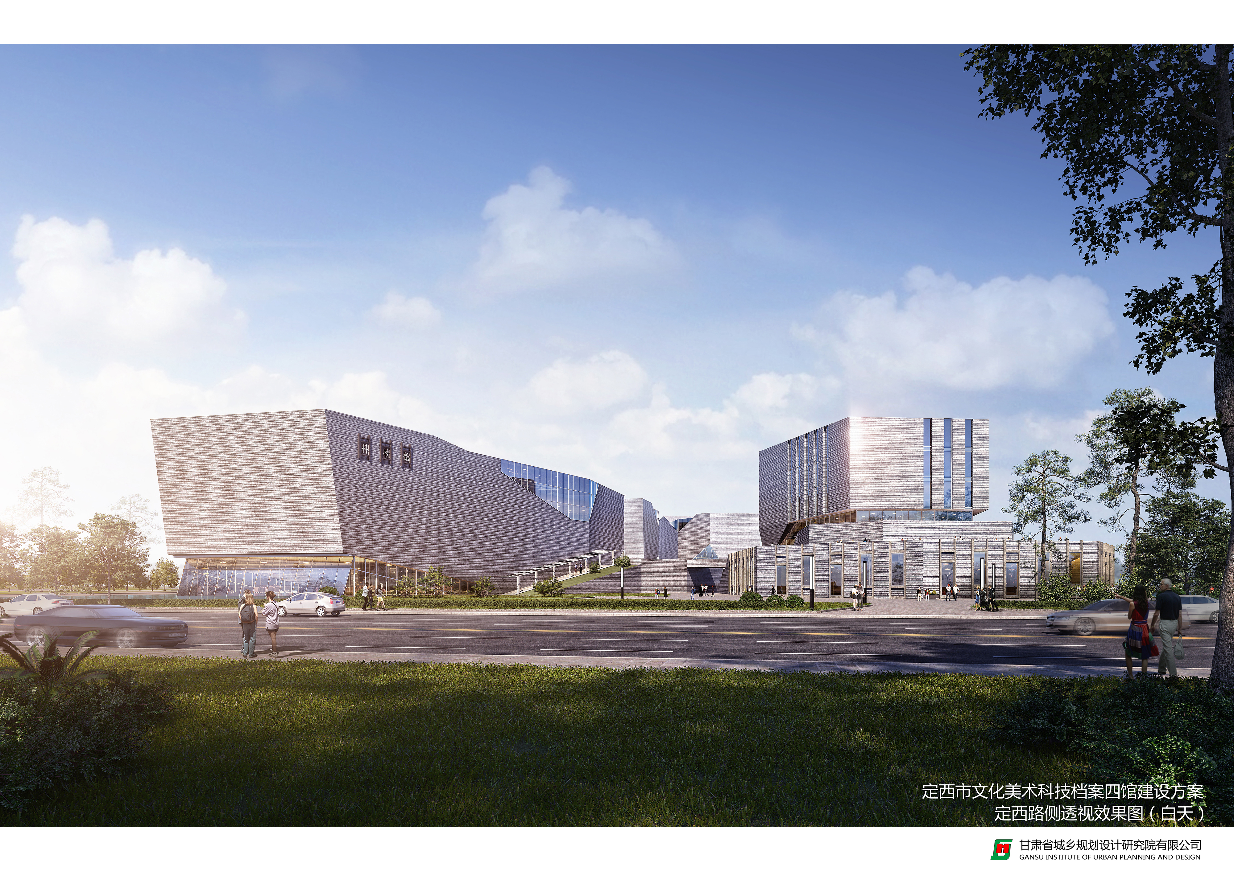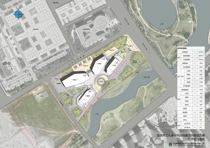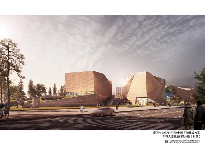 项目位置:位于定西市新城区,东至新城大道、西至定西路、南至小碱沟绿化带、北至行政内环南路。 方案一 设计理念:“山水陇中,文化之窗”,意在结合定西公园以及场地周边其他绿地景观,将建筑物以山石雕塑形态抽象展示,与周边环境结合,唤起人们对陇中山水的遐想。设计采用双首层界面,以此丰富建筑的竖向界面,为建筑提供充足的室外展场,同时也为场地绿化的实现,提供更多可能。此外,建设场地也充分考虑当地悠久的曲艺文化,为这些“有声”的文化宝藏展示提供空间,真真达到全方位展示定西风采的设计目的。 经济技术指标:总建筑面积72078平方米,其中地上建筑面积50768平方米(文化馆8796平方米、档案馆8996平方米,科技馆17986平方米,美术馆14990平方米),地下建筑面积21310平方米(四馆合建)。四馆建筑均为地上5层,地下1层,除档案馆建筑高度为28.20米外,其余三馆建筑均为25.20米。容积率1.38,建筑密度44.67%,绿地率20%,停车位430辆。 方案二 设计理念:“定西之门”,基地东侧为定西湖,湖的形状是定西的行政区域,隐喻定西。基地位于定西湖西侧,“定西之门”是对定西名称、历史地理意义和“一带一路”上的重要节点的概括和诠释。 建筑布局采用动静分区的方式,由西向东依次是文化馆、档案馆、科技馆和美术馆。其中文化馆、科技馆和美术馆位于场地北侧临近市政道路,处于“动”区;档案馆日常进出人员较少位于场地南侧,处于“静”区。文化馆和档案馆通过共享中庭相连,立面上构成了“门”的造型。科技馆采用中轴对称的结构,中庭采用圆柱造型,内部设计红色蜿蜒的“丝路飘带”装饰,寓意着一带一路。两边采用方正的玻璃幕和铝板格栅,方圆结合,显得大气硬朗。美术馆同样采用中轴对称的结构,建筑外框为石材装饰,中部为玻璃幕墙,建筑立面同样体现着“门”的造型。整个场馆建筑布局方正大气,和政府统办楼形成很好的呼应关系,建筑主要立面材质为石材和玻璃幕墙。 经济技术指标:总建筑面积72445平方米,其中地上建筑面53233平方米(文化馆9669平方米、美术馆14670平方米、科技馆17497平方米、档案馆9669平方米),地下建筑面积19212平方米。文化馆和档案馆为4层建筑,建筑高度21米;科技馆为4层建筑,建筑高度为27米,美术馆为5层建筑。容积率1.44,建筑密度41.32%,绿地率35.80%,停车位533辆(其中地上停车位53辆、地下停车位480辆)。 方案三 设计理念:“山环水绕+气脉相承”,顺应长形用地的固有特点,将建筑一字排开,形成连续不断的城市整体印象。再通过建筑的形体错落创造出变化丰富的外部空间、从而形成建筑与景观、广场参差错落、彼此交融的空间格局。通过建筑的连续排布,展现出一气呵成的整体气势。四个馆虽处一地,但各自功能完全独立,管理运营也分别隶属不同部门。因此,在建筑排布上选择将各馆独立设置,以便于各单位分别运营。每个馆都有自己独立的出入口,互不干扰。建筑由西向东依次是档案馆、科技馆、文化馆、美术馆。 经济技术指标:总建筑面积68830平方米,其中地上建筑面积50330平方米(文化馆8100平方米、美术馆15180平方米,科技馆18150平方米,档案馆8900平方米),地下建筑面积18500平方米;档案馆和科技馆为三层,建筑高度为20米,美术馆和文化馆为四层,建筑高度为25米。容积率1.37,建筑密度39.80%,绿地率28%,地下停车位490个。 |