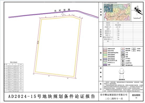 AD2024-14号地块位于安定区内官营镇永丰村,用地面积为13352.8平方米,AD2024-15号地块位于安定区内官营镇永丰村,用地面积为41587.9平方米。为加快推进项目顺利落地,依据相关规范、技术规程、规划方案、同类项目案例等综合论证,合理的定制规划设计条件,提出地块用地性质、项目规模等相关控制指标及规划管控要求,为项目的审批提供依据。经区政府同意,我局委托信宇腾远规划设计有限公司编制了《AD2024-14号地块规划条件论证报告》、《AD2024-15号地块规划条件论证报告》,为广泛征求社会各界的意见和建议,现将地块管控图则主要内容按程序进行批前公示。