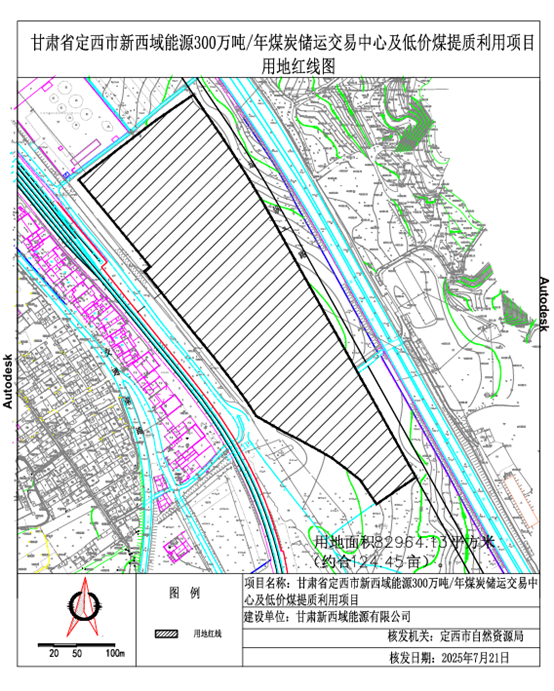 审批事项名称:建设用地规划许可证 项目名称:甘肃省定西市新西域能源300万吨/年煤炭储运交易中心及低价煤提质利用项目 建设单位名称:甘肃新西域能源有限公司 许可证号:地字第6211002025YG0010553号 (621100202500008号) 项目位置:位于安定区景家店陇中仓储物流园内,东至运纵路、南至拟建定西市低空物流枢纽中心、西至空地、北至空地。 用地面积:用地面积约82964.129平方米(合 124.45亩) 发证日期:2024年7月21日 联系电话:0932-8312726 用地红线图